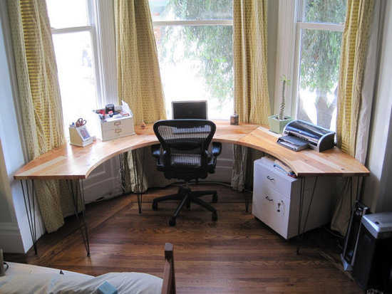 图中所示的专供飘窗台的办公桌,一下子就把这块让人伤脑筋的角落变成了称心如意的办公角。充裕的光线、赏心悦目的视野,飘窗所能提供的这一切没准能激发你的灵感!