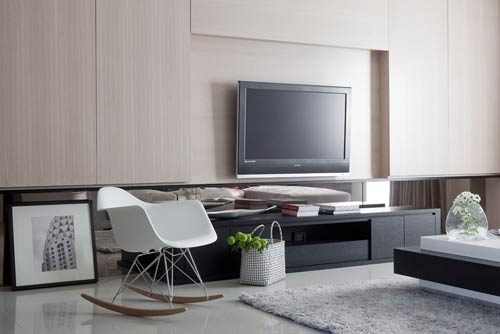 编辑点评:客厅没有过多的柜体,因此把必要的收纳功能,尽数融入在电视墙的木皮设计里。