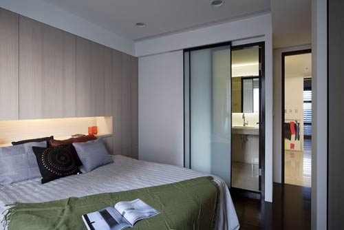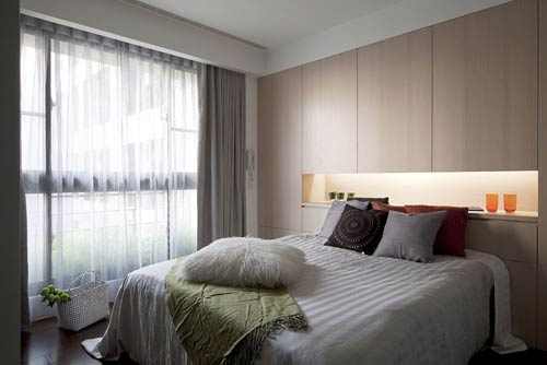 编辑点评:床头的柜子局部留空,方便男女主人随手摆放手机、时钟等物品。