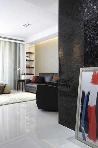编辑点评:玄关黑亮的石材,展现低调奢华风采,颜色的变化作为玄关空间的分隔。
