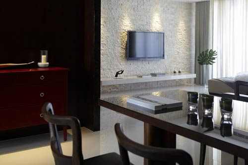 编辑点评:电视背景墙采用大块凿面石材,在灯光效果下,自有一股从容休闲的居家氛围。