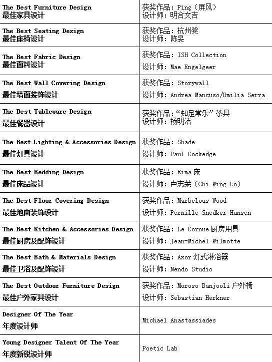 伴随着现代生活方式的不断变化,设计在日常生活中扮演的角色越来越重要。设计不只是实用性与艺术性的结合,更在强调工艺精湛、文化传承、材料革新、人性关怀等,让设计品承载了更多关于文化、生活和美的梦想。关注更多生活中精神层面的诉求,帮助人们完善自我的生活情怀,是国内外设计师们共同关注的话题。从2013年获奖的作品中可以看到,每一个精心设计的作品,无论是陈旻设计的将材料美感和人体工程学结合的杭州凳,杨明洁设计的东方情怀系列茶具,还是意大利设计师Andrea Mancuso和建筑师Emilia Serra共同打造的故事墙,或是英国设计师Paul Cockedge创造的漂浮灯具,无一不表达出了设计师对生活美学的用心——与设计一起生活,让艺术不再变得触不可及,是现代设计师们共同努力的方向。