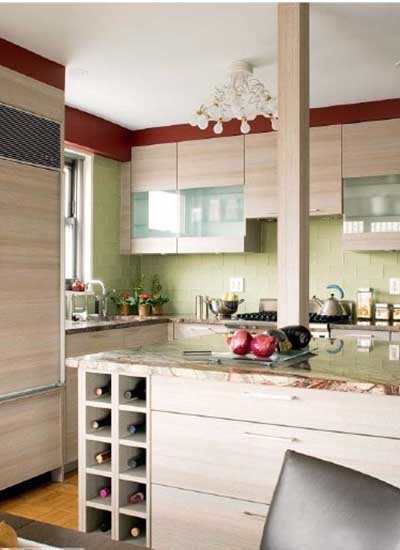 空白墙上覆盖的橱柜面板,最好将它利用起来,设计几道凹槽安置薄薄的橱柜面板,摆放一些漂亮的厨房工具或酒品,点缀几个跳跃的色彩亮点,这就是一处展示品位和情趣的空间。