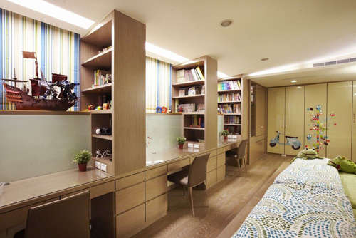 编辑点评:三个小男生的房间,选择活泼的绿色布置,并以收纳柜独立出个人书桌;床下地板架高的部分都是抽屉,收纳三个小朋友的玩具。