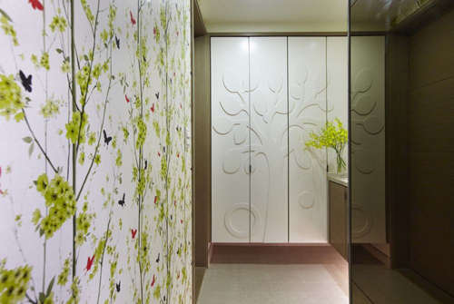 编辑点评:进入男孩房前的玄关,树状浮雕造型的柜子提供置物功能。