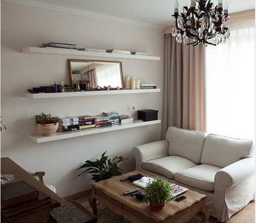 如果客厅的面积非常局促,甚至无法满足一个沙发边柜的摆放需求,那么将搁架设计在沙发边上,随手可得。