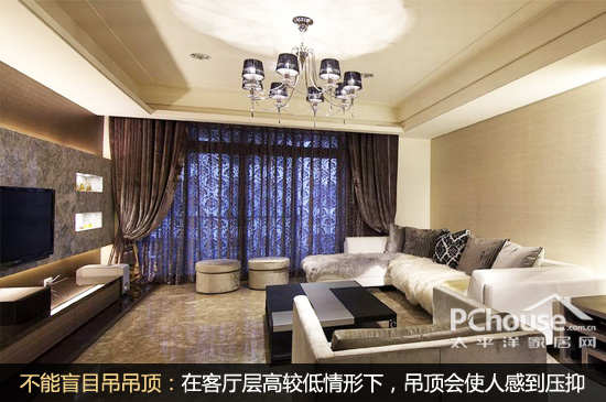 不少人认为客厅装上吊顶后很大程度上会提升家的档次,因此不顾客厅实际情况,盲目装上吊顶。事实上,不是所有的客厅都适合装吊顶。在客厅层高较低,空间相对狭小的情形下,如果还装上吊顶,在视觉上会使人感到紧张、压抑,继而引发人生理上的不良反应。