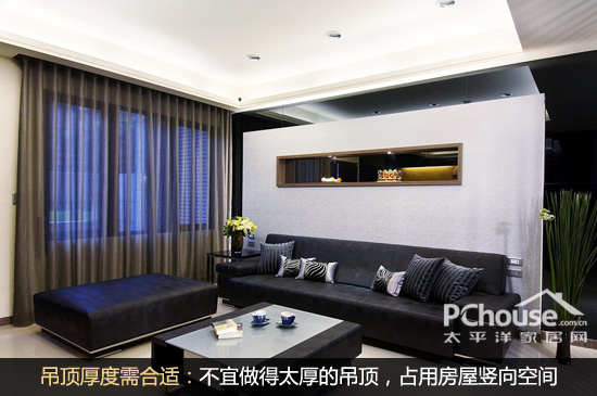 吊顶不同的厚度会给人不同的心理感受,在装修前,需计算好吊顶的厚度。如果客厅高度只有2.6-2.8米,最好选择在天花四周做简单的吊顶,不宜做得太厚的吊顶,占用竖向空间。