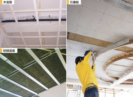 客厅吊顶往往由龙骨和石膏板构成,其中龙骨起支架作用,主要分木龙骨和轻钢龙骨两种。木龙骨价格便宜,容易做出各种造型,不过存在较大的火灾隐患。而轻钢龙骨防火、防潮性较好,由于强度较大,不易做成特殊造型的吊顶。