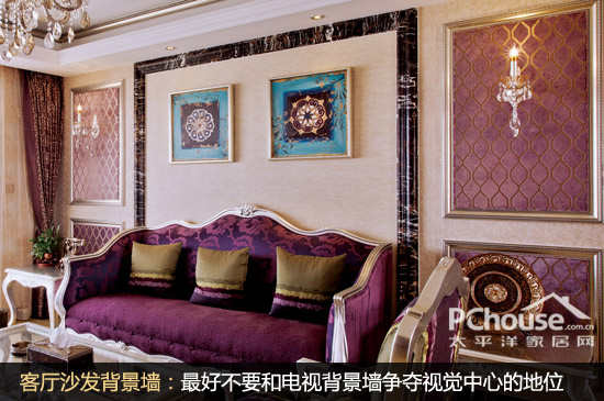 客厅除了电视背景墙,还可以在沙发背景墙上花一点心思。不过沙发背景墙最好不要和电视背景墙争夺视觉中心的地位。常见的形式是挂画或相框、或贴上壁纸、或做成比较柔和的软包背景墙。