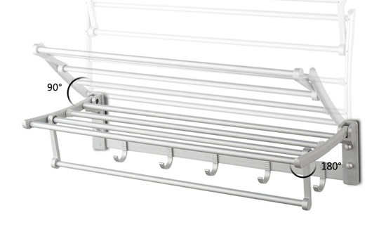活动式的毛巾置物架,可实现90°的灵活翻转表现,在不需要使用毛巾置物架的情况下,可将毛巾架支起,有效节省卫浴空间。