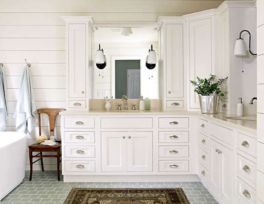 编辑点评:L型洗漱台不浪费任何空间位置,将收纳和展示功能提高到极致。而白色作为主打色,洁净大方,空间舒适感倍增。
