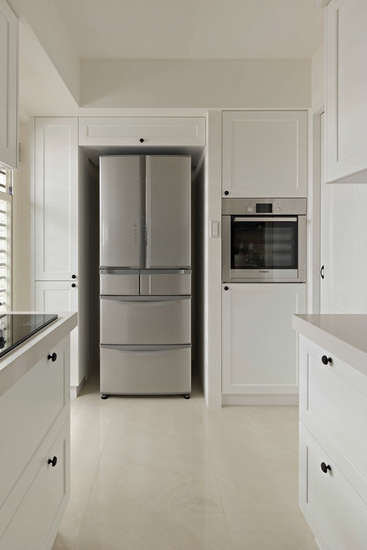 编辑点评:预留出置放大冰箱的位置,将电器镶嵌在适当顺手的地方,再次证明小空间也能有便利好用的厨房。