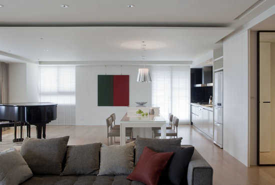 编辑点评:在三角钢琴旁的落地窗,可望向对面的国家剧院;以此为风格主轴,设计师利用干净的基底,以及家俱装饰,把现代艺术的氛围带进空间。
