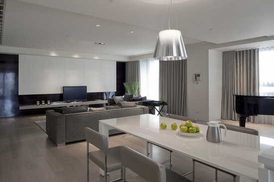 编辑点评:电视墙使用黑白二色,成为俐落有型的对比。而光亮滑面的烤漆质感,也呼应了后方三角钢琴。