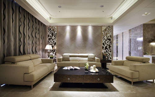 境庭国际设计的周靖雅总监,透过充分沟通与细心观察,让每个空间有着独一无二的巧思创意。客厅主墙透过大尺度裁切下的石材表现,搭配上方的间照效果,以优雅内敛诠释大宅磅礡气度。