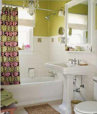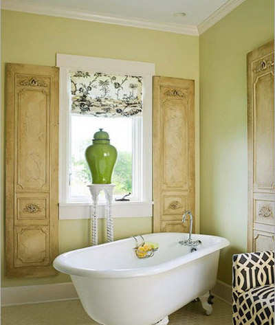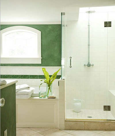 草绿色如果大面积运用可能会稍显沉闷,不妨作为点缀掺杂在其他墙面上色调中间更为醒目。清新的草绿搭配白色的墙面衬衣白色瓷砖,房间干净明亮。