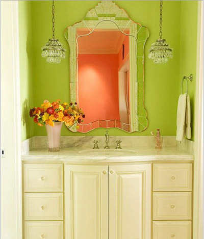 苹果绿的颜色让人仿佛置身自然之中,新鲜充满生机。透过镜子看到背面橙色的墙面色调更为欢喜,空间变化丰富。这一点橙色搭配苹果绿的墙壁一下抓住了人们的眼球,冲撞意味十足,和空间充满现代感的家居摆设相处融洽。