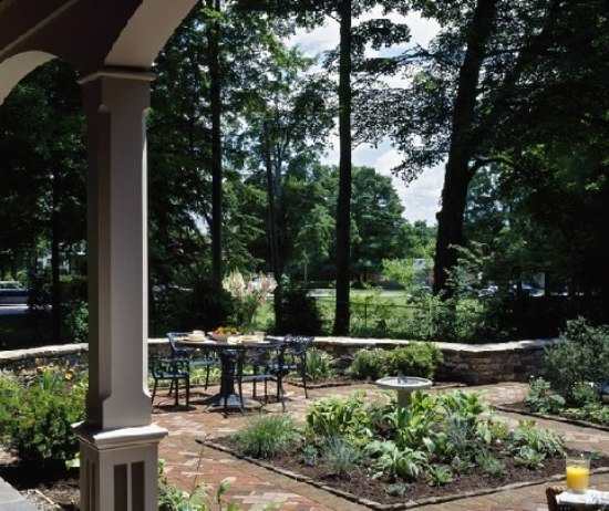 有一种经典的草本植物园的设计由一些小型花床组成,之间是一些砖铺小路。这个庭院则将这种设计扩展到了整个院子里,并留出了放座位休息的地方。一层层的绿色给院子增加了趣味,同时也与院子外的景观遥相呼应。