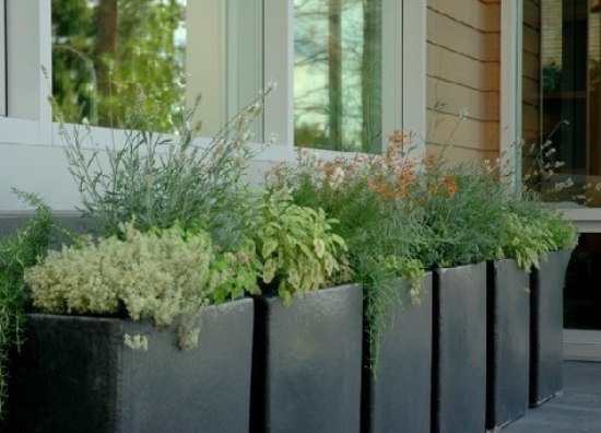 圆形的金属容器,带着一些斑斑锈迹,是许多草本植物的绿色叶子的完美陪衬。这些容器是经久不衰的矩形木质花盆的现代造型。将草本植物种在花盆里可以使那些体型较小的植物在整个景观中突出出来。