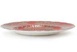 小编点评:这款餐盘,花瓣形的边缘,做工精细。鲜艳的红色底饰有金色鸟类图案,透出典雅时尚。
