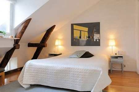 这个卧室设计在一个三角形的空间里,利用了不规整的空间。装置两个亮度适当的台灯,把卧室营造得充满浪漫情调。