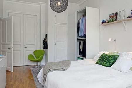 这个卧室以白色为主色调,散发着一种纯净温馨的气息。床头的壁灯像两朵百合花,实用之余不失魅力。处于房顶中央的镂空型灯饰则给人带来一种仰望星空的静谧的感觉。当然搁架、衣柜一如既往地发挥收纳作用。