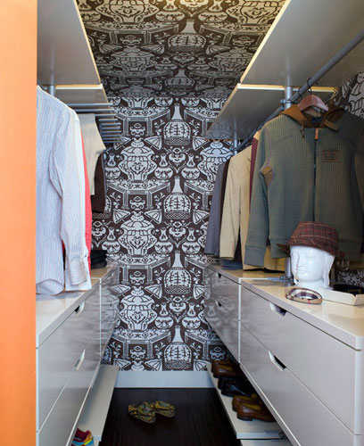 给空间划分出一个狭长的小空间,用来打造独立式衣帽间,两侧是对称的收纳配置,让小空间极致利用,上层作为悬挂,中间层作为抽屉,底层则用来收纳鞋子,装饰上也没有马虎,墙壁用美丽的壁纸包裹,充满趣味。