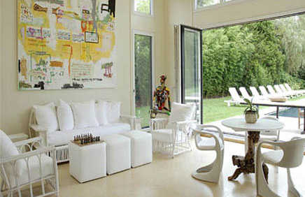 客厅选用白色沙发和桌椅等家具,洁净大方,造型也很时尚高雅,墙上的壁画艺术感很强,可以看出主人美和艺术的追求。