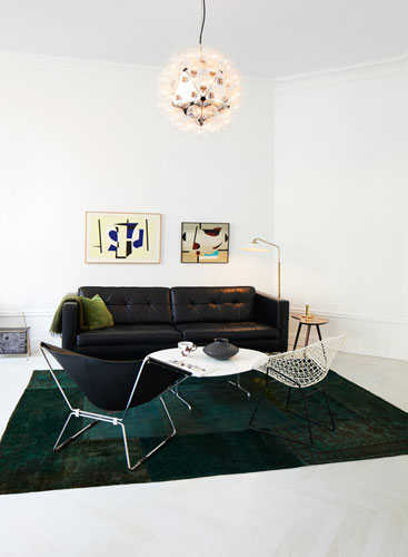 白色的空间,需要深色的点缀,墨绿色地毯十分出挑