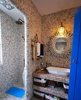 隔墙选择和墙壁一样的马赛克瓷砖,把洗漱区和淋浴区的整体感,洗漱台的分层搁架设计能有效地节约空间。镜子的风格很有文艺复兴的感觉。