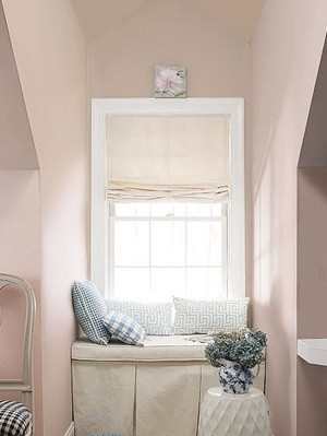 粉色墙体,将整个空间都调和成温柔浪漫的气质,阁楼样式的空间中,两面墙体中间空出了一小块内嵌样式的角落,因为有了窗户的点缀所以这个空间自然而然的就设计成飘窗了,无论是其上抱枕的样式、颜色还是下方软垫以及植物的选择都很好的符合整体风格。