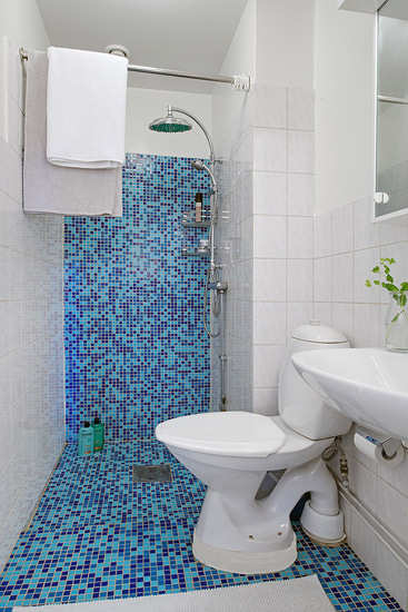 编辑点评:用蓝色马赛克装修卫浴的地板和沐浴区背景墙,使其呈现出L型的立体空间,渐变的蓝色营造出独特的视觉效果和色彩跳跃感,让小卫浴充满地中海风格的清新与活力质感。