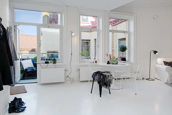 【太平洋家居网 设计频道】就算一个人生活也不能过得太糙太随意,来自瑞典的美女便向我们展现了其敞亮整洁、充满小资情调的单身公寓。该公寓面积为50平,采用开放式的空间设计,室内地板和背景墙均是干净的白色,同时家具、橱柜和床铺等也选用白色,打造出一个敞亮、清爽的白色家居。