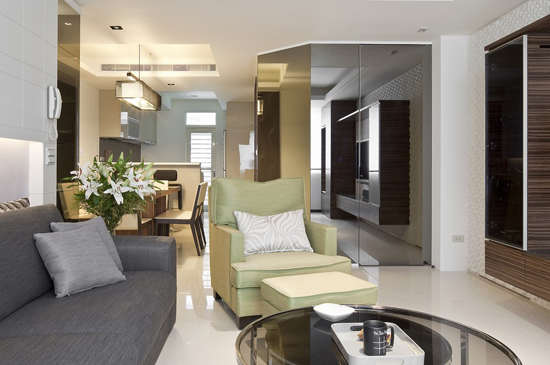 编辑推荐:黑镜完整包覆转角,隐藏通往客厅卫浴的门,也虚化掉转折的锐利度。