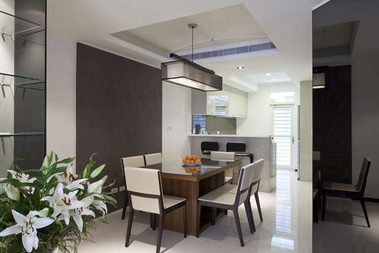 编辑推荐:沉稳深色调的空间,用一盏主灯与柔和的间接照明,烘托出雅致的用餐氛围。