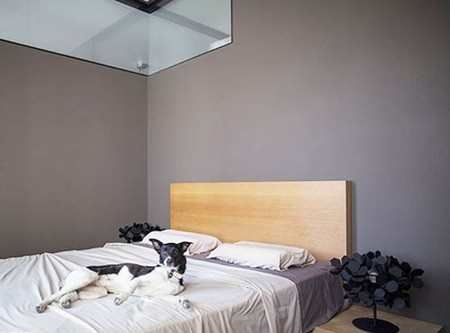 另一丰富现场空间感的手法是将卧室隔断墙的上部分设置为透明玻璃。透明玻璃允许视线通过,故而能使空间看起来没有那么拥挤。可以试着用手遮住玻璃,假设上部分也是白色墙面,相信马上就能感觉空间变封闭了。全白墙面带来的视觉体验比较平庸,没有加入透明玻璃的隔断墙那么灵动。