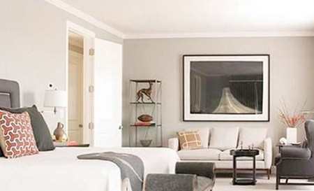 同样是灰色,因为饱和度的不同,深灰色和浅灰色都属于百搭的颜色,用它们设计房间整体的底色,不同的深浅度和闪亮银色家具彼此衬托、呼应,搭配灰色的家具、窗帘以及饰品,整个房间色彩运用华美却不张扬。