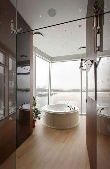 编辑点评:巨大的按摩浴缸置于卫浴中心,大面积的玻璃背景墙赋予极佳的视野和景致,大大提升了舒适度。