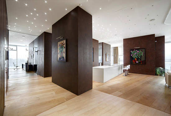 编辑点评:超长的白色吧台几乎横贯公寓的一半宽度,充分地延伸了视线,更为厨房创造了充裕的操作台空间和拓展了用餐区。