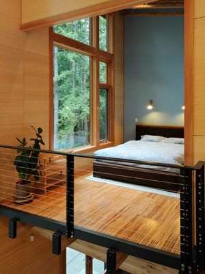 一楼主要是公共空间,二楼则更为私密。用单透玻璃做隔断打造了一个橱柜式的卧房,是一种令人耳目一新的设计,以此维持这透明度并享有开放的空间感。在卧室休憩,可以透过玻璃望向房间,看看电视或者欣赏窗外的美景,自然十分美妙。