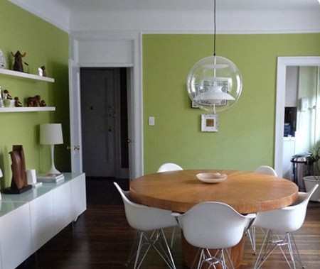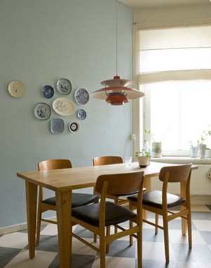 浅蓝的墙面搭配象棋盘的地板砖和自然感强烈的原木餐桌椅,十分淡雅的家居氛围,放在夏天也会倍觉清透。墙面装饰花了不少小心思,餐桌上的吊灯更是精心挑选,不仅外观独特,造型别致,色彩搭配上也选择了暖色调跟室内色彩相呼应,一点橘黄让是室内多了一点温暖的味道。