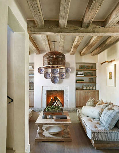 编辑点评:设计师在原木天花板下面增加金色圆柱型吊灯,给空间提供足够亮度,巧用金属元素给自然气息浓厚的空间增色。在床尾墙壁设置格子陈列柜,打开空间收纳功能,也于天花板,窗户一起展现整体空间的立体感。