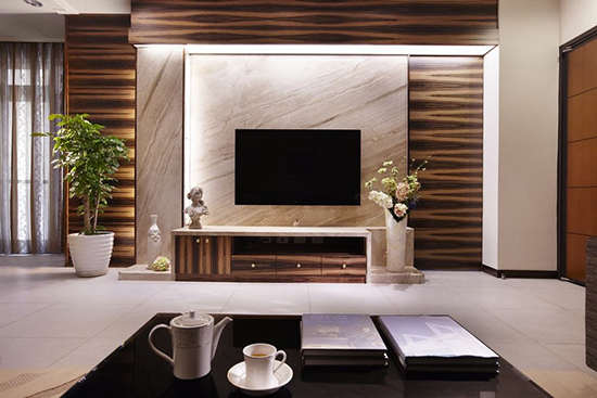 2、 进大门右边为鞋柜,鞋柜、电视柜、小酒吧一体设计,更具整体性美观。