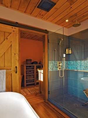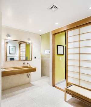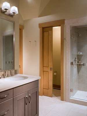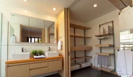 移门不同于其他类型的门,对空间要求不高,本身作为门的同时更是能很好地用于空间隔断。用一扇木质移门将洗浴空间与收纳储物空间分割开来,划分出不同的功能区。木质移门,色调跟室内保持一致,清爽自然。移门本身依靠台盆边缘设置,本身所占空间不多……