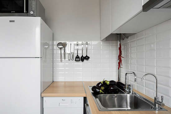 编辑点评:活用墙面增加挂钩进行厨具收纳,美观又实用;白色瓷砖背景墙的线条若隐若现,充满质感。