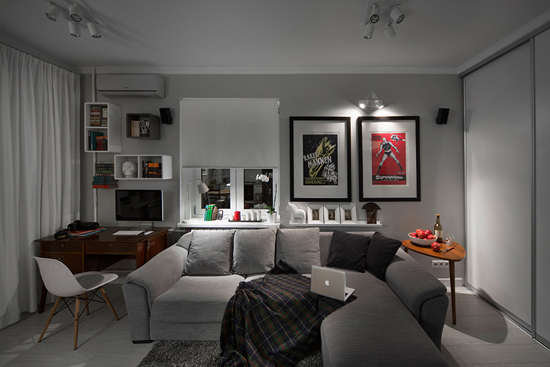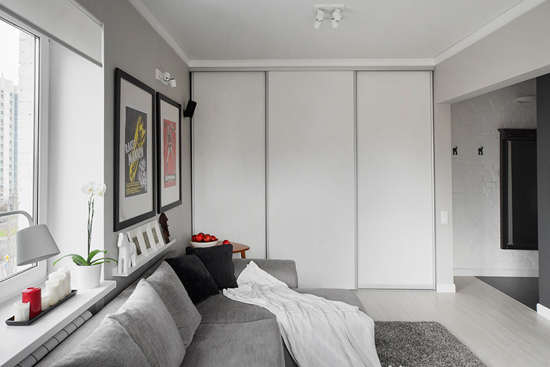 【太平洋家居网 设计频道】这是一间灰白色调的紧凑型单身公寓,复古与时尚元素的巧妙混搭让公寓充满个性。室内布局省去了多余的隔断设计,呈现出敞亮舒适的家居环境;以灰白黑棕四种冷色调为主打的室内装饰让空间洋溢着沉静稳重的“阳刚之气”,十分适合单身的白领男士。