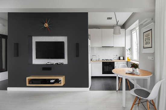 编辑点评:电视背景墙设计十分时尚,黑白灰三色形成了强烈的色彩对比和视觉跳跃感,凹陷的电视屏幕区和凸出的电视主机柜则让背景墙的立体感和层次感更加鲜明墙壁,上方的时钟设计也很有创意。