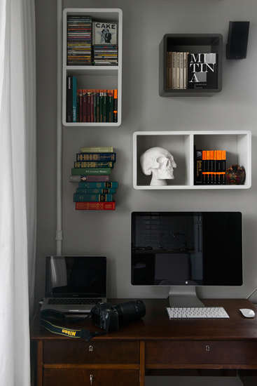 编辑点评:书桌背景墙设置敞开式的吊柜作书籍收纳用途,形状不一的吊柜层次错落,充满立体感。