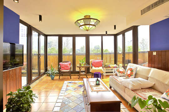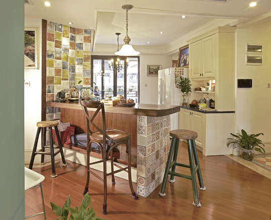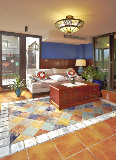 编辑点评:大面积原木色地板中央嵌入彩色瓷砖,设计独特,吸引眼球,利于打破中规中矩的严肃感,跳跃居室氛围,凸显动感美。